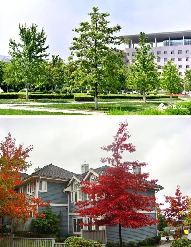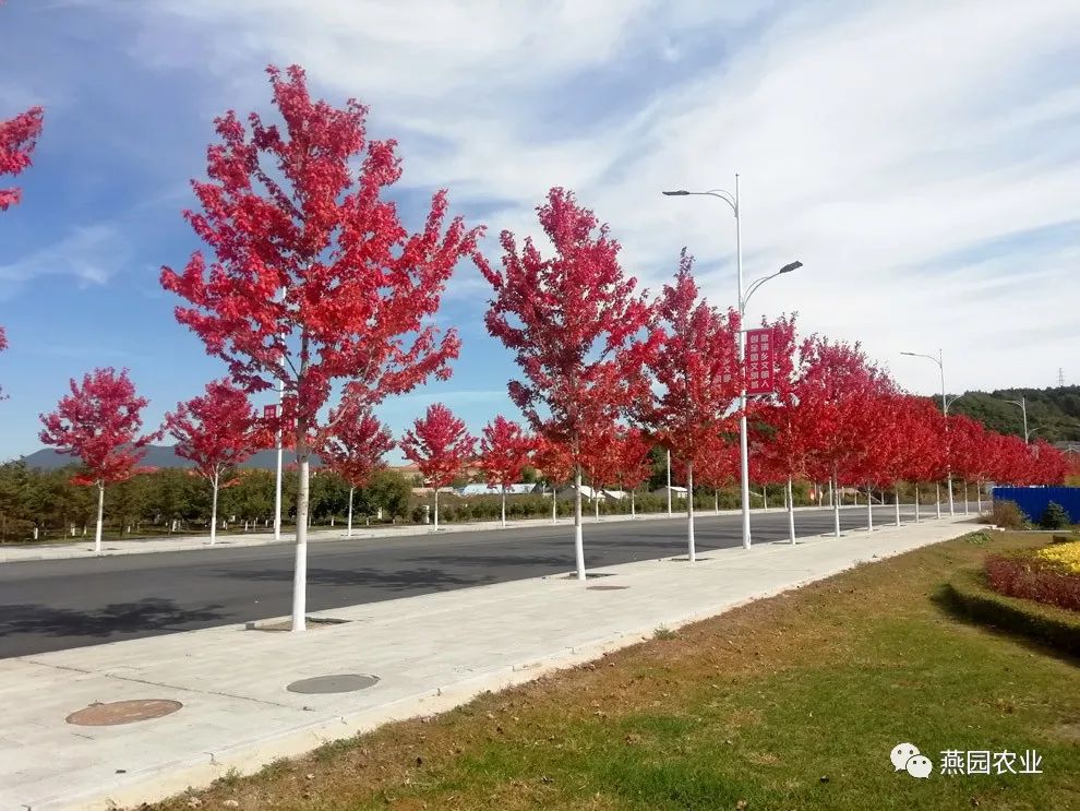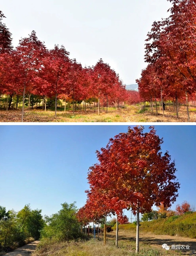 秋季叶片橙红至火红色,树体高大,树干笔直,树冠开阔饱满,抗逆性强,生长较快,移栽成活率高,是目前国内应用最早的彩色苗木之一,且在全国范围内已被大量栽植。是市政、地产、高校、私家庭院非常受欢迎的彩色树种。