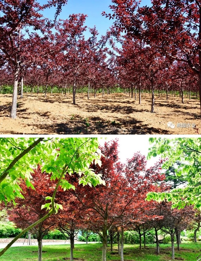 叶片三季紫红色,早春开淡粉色小花,花量大,树形为开阔规整的圆形,树冠丰满,枝叶茂盛,具有一定的抗旱能力,较耐水湿,适应能力强范围广,抗逆性强。是道路、公园、庭院等景观绿化推荐品种。适应辽宁及以南地区。