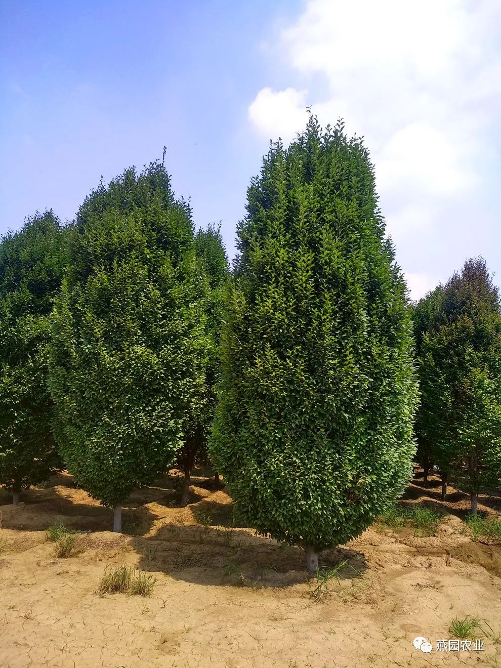 欧洲鹅耳枥初见的印象有别于传统的苗木。因低分枝点让骨干枝看起来粗矮,搭配上肥美椭圆的树形让整株苗木远看起来短小精悍,但走近后紧凑茂密的枝叶、圆润饱满的树冠、高大雄伟的树体又像一彪形大汉立在眼前,憨厚而结实不自觉地就充满安全感,惹人想依靠。