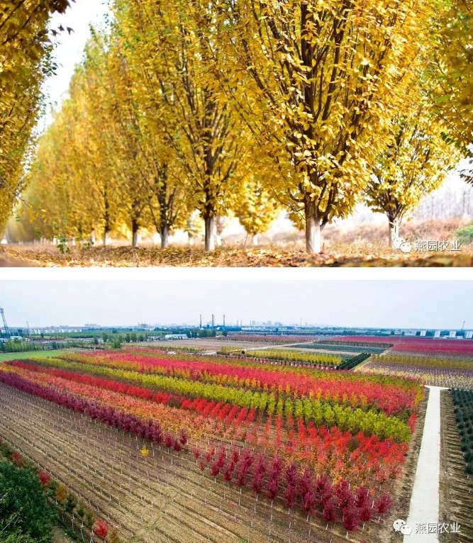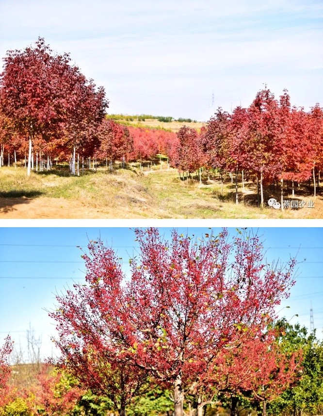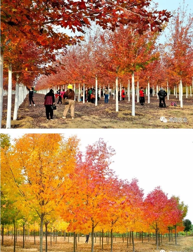 四. 泰安园区栽植有欧洲鹅耳枥、美国红枫、美国秋紫蜡、彩叶豆梨、凤凰梣叶槭等多种彩叶苗木。拥有色彩层次丰富的秋季景观效果。其中欧洲鹅耳枥更是国内鲜有的特色树种,雄伟的树姿、紧凑的树冠、艳丽的叶色,为赏秋之旅增添了激情与乐趣。