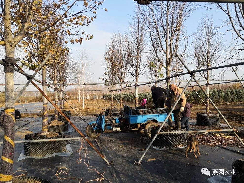 将土球包裹严实的苗木移入容器中继续生长,为不同季节的苗木需求做好准备。