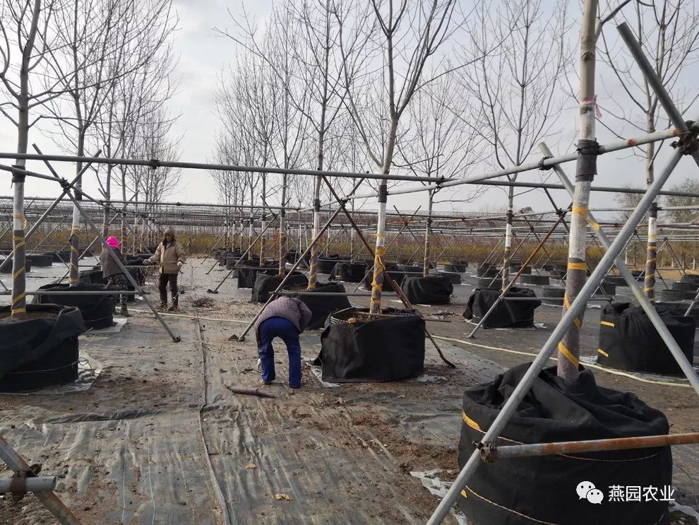 冬季在控根育苗器外部及苗木树干处加裹毡布,为苗木做好保暖防寒工作。