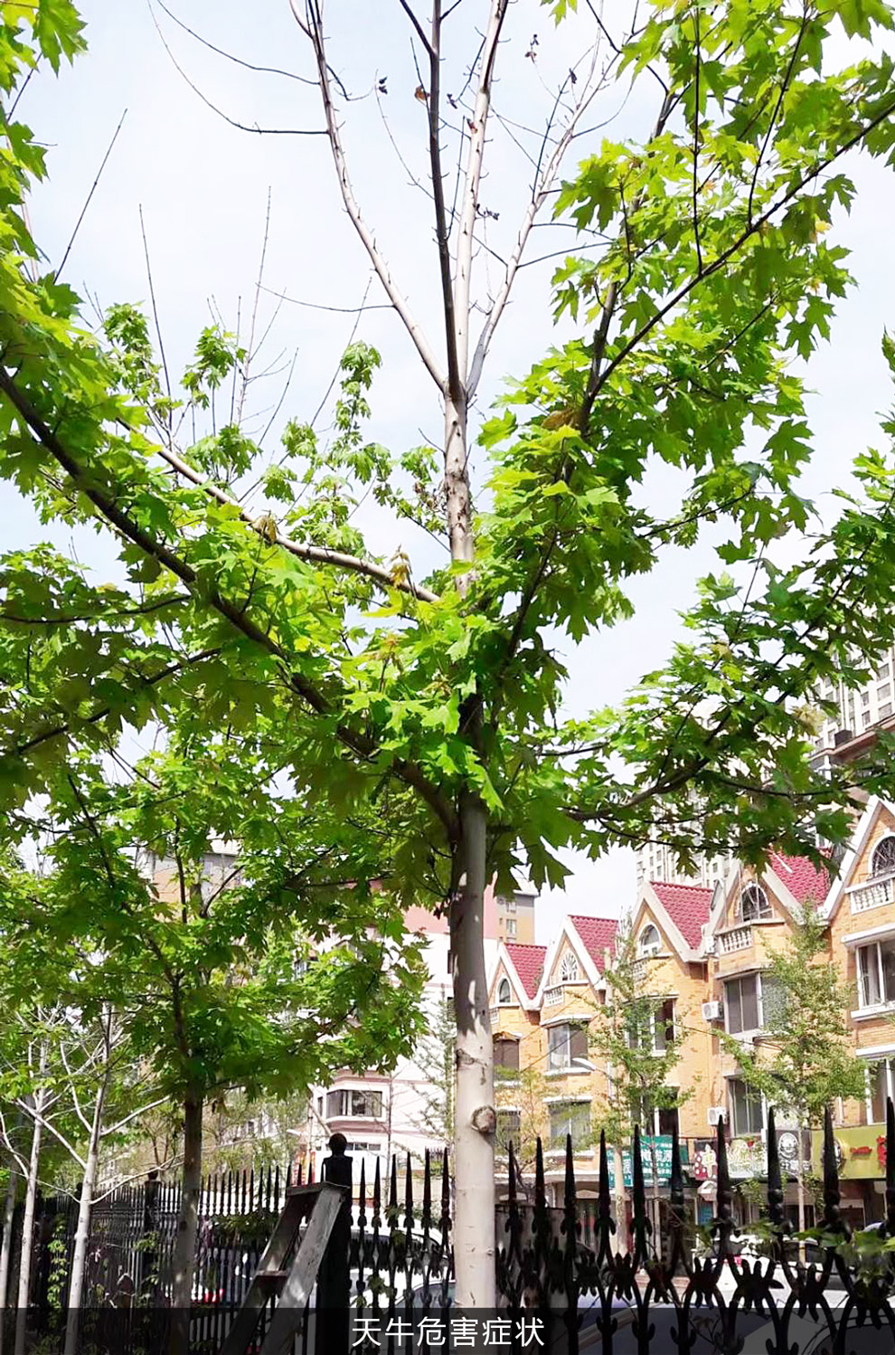 二、病虫害防治:1、刺吸式害虫(蚜虫、螨虫、粉虱、蚧壳虫等):蚜虫、粉虱用10%烯啶虫胺可溶性液剂稀释2000倍~3000倍均匀喷雾或25%吡蚜酮可湿性粉剂2500-3500倍交替使用。螨虫用阿维哒螨灵1000-1500倍进行均匀喷雾。蚧壳虫用20%杀扑·噻嗪酮乳油1000倍进行喷雾1-2次,每次间隔10天左右,喷药时一定要全面彻底不要留有死角和漏喷。 2、食叶害虫(美国白蛾若虫、叶蛾、刺蛾、天幕毛虫等):用2.5%溴氰菊酯乳油1000-1500倍和灭幼脲三号1000倍进行防治。 3、蛀干害虫(光肩星天牛等):用绿色威雷200-300倍对树干和地面进行喷药。6-8月用人工捕捉成虫和刮除虫卵。幼虫期向虫道口注射氧化乐果、敌敌畏等农药或沾用农药的棉球追洞并用粘性泥封住虫道口进行防治。总之,蛀干害虫的防治要实行“三结合”的原则,(一)提前预防结合追肥根施内吸性药剂吡虫啉、氧化乐果等药液,同时可以控制其它虫害。(二)成虫期全树喷施绿色威雷和灭幼脲3号;(三)向虫洞、树干注射或挂吊瓶,可用蛀虫灵、氧乐果、敌敌畏、杀虫双、甲胺磷等药液进行防治。