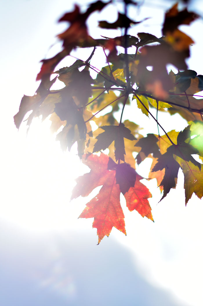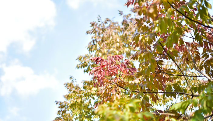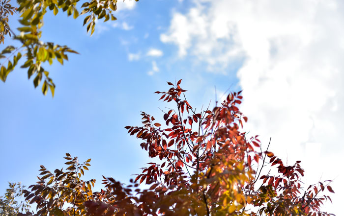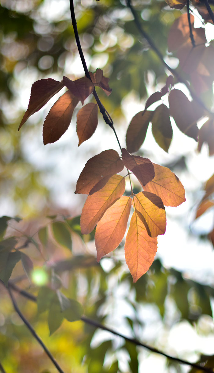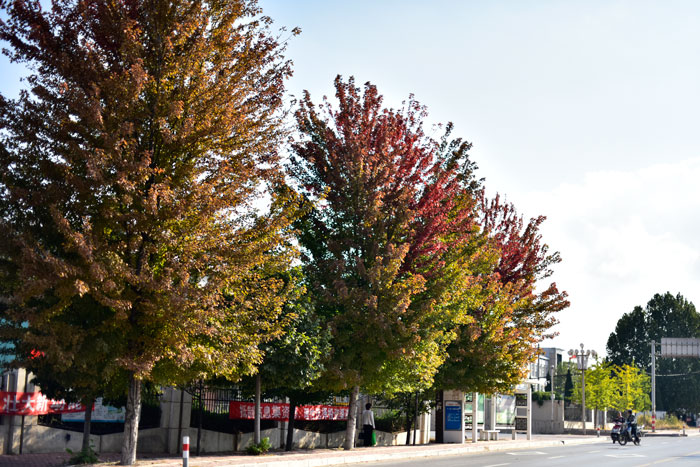 随着气温的变化,昼夜温差越来越大,叶片内的叶绿素逐渐褪去,而叶红素、叶黄素留存下来,使得绿叶变彩叶,温差越大,叶绿素流失越多,叶红素、叶黄素浓度越高,叶片色彩也就越鲜艳。因此,秋叶的色彩,时时刻刻都在变化。