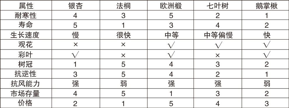 在行道树体系中,名气最大团体的就是“世界五大行道树”了,公认的世界五大行道树是:银杏、法桐、欧洲椴、七叶树和鹅掌楸,这五个树种在全世界都有非常广泛的应用,是世界行道树中的顶梁柱。现将前面提到的十大指标套用在这五个树种中,一一对比,表现最好的(或最多、最高的)得5分,最差的(或最少、最低的)得1分,对比情况如下: