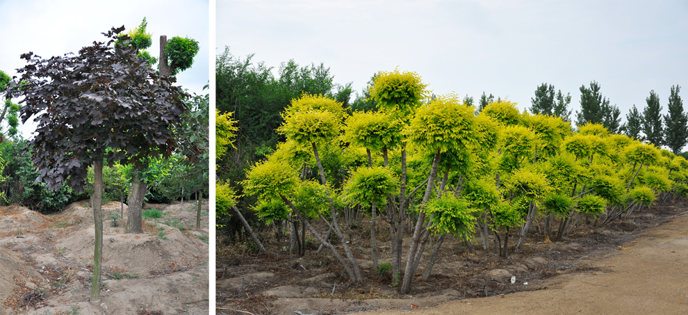①将过剩小苗培养成丛生苗。三五棵、八九棵小苗栽成一组,培养成从生苗木,冠径大,效果好,绿化中的应用也不少。②将过剩小苗培养成花瓶或其他造型苗。三十二株、四十八株小苗编成一组,用模子固定,培养成花瓶类苗木,与常规苗木有所区别,在园艺中的应用也会很广泛。