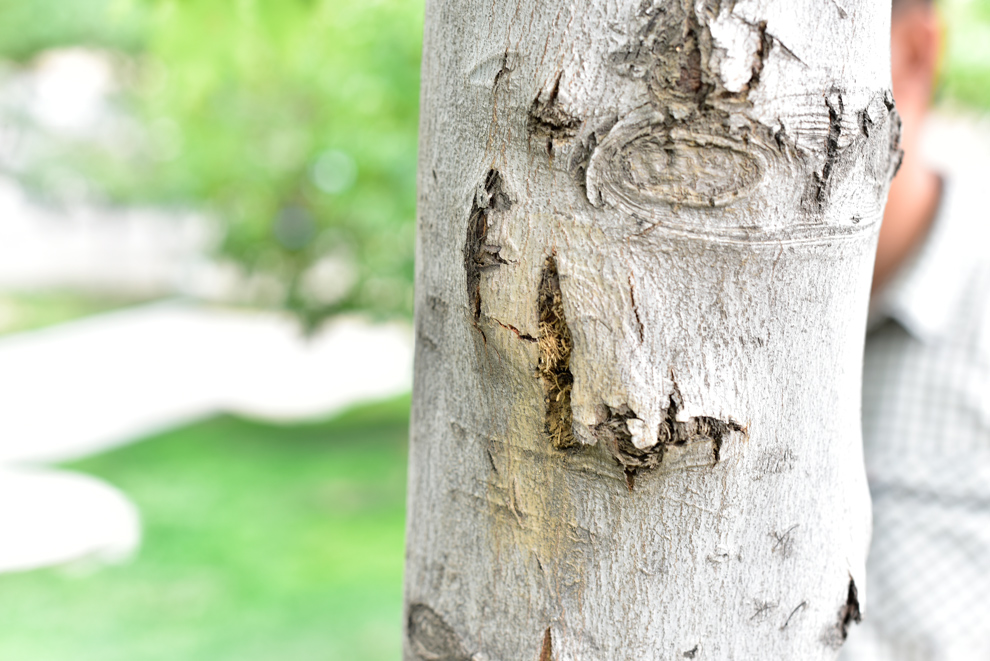 天牛虫害严重,部分树木已经截头,在树干上发现有新的蛀屑。