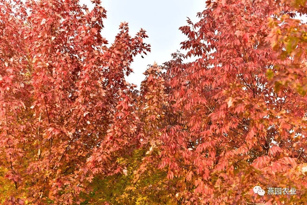 业内公认唯一能与美国红枫相抗衡的红叶大乔木即是秋紫蜡,往年秋紫蜡变色期比红枫要早,今年两个树种同时变色,可以看出,在色彩上,秋紫蜡完全可以与红枫分庭抗礼。秋紫蜡庞大的圆形树冠,以及更为浓艳的色彩,为其增添了不少红枫所不具有的魅力。
